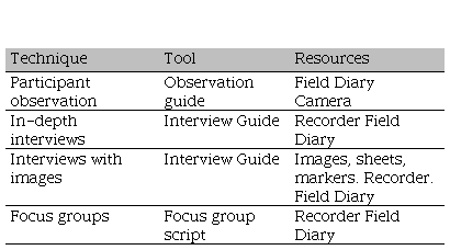The second moment of the investigation is the application of information gathering techniques. For that, several interactive research techniques have been selected, based on continuous dialogue and active participation of the community in the research process. Subsequently, the structure and format of the data collection instruments were designed.