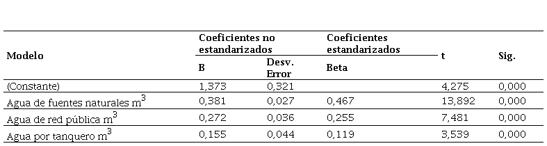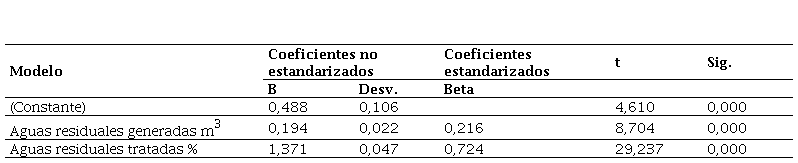 En la tabla 3 se muestran los resultados del modelo 2. En principio se recabaron los coeficientes del modelo, para lo cual se consideró un nivel de confianza del 95%. Las variables consideradas como explicativas para este modelo fueron: aguas residuales generadas (m3) y aguas residuales tratadas (%). Posteriormente, se comprobó que el análisis de varianza (ANOVA) del modelo sea significativo (α < 0,05), es decir, existe una relación lineal significativa entre la variable dependiente y las independientes.