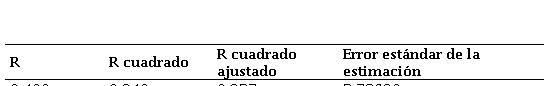 En la tabla 2 se analiza el resumen del modelo 1, en la cual constan el valor R, R. y R. ajustado; para este modelo con múltiples variables es óptimo evaluar el R. ajustado, en este caso es de 0,237, lo que significa que el modelo está explicado en un 23,7% de la varianza por las variables independientes consideradas. A continuación, se presenta la ecuación del modelo 1:
