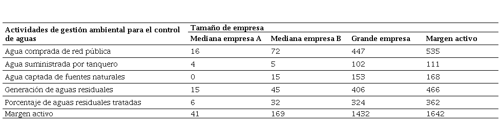 En la tabla 5 se observan las frecuencias de las variables cualitativas, en donde consta la cantidad de empresas (por tamaño empresarial) que aplicó cada una de las actividades de gestión ambiental para el control de aguas.