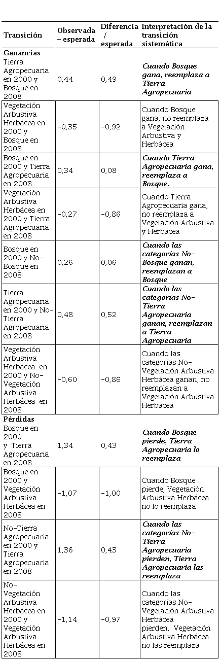 Por otro lado, la segunda sección de la Tabla 9, muestra las transiciones sistemáticas calculadas en términos de pérdidas entre 2000-2008. Se destaca que, cuando la categoría “Bosque” pierde territorio, es reemplazado principalmente por “Tierra Agropecuaria” más que por “Vegetación Arbustiva y Herbácea”, a un ritmo 0,43 % más rápido al que cabría esperar en un proceso de pérdida aleatoria.