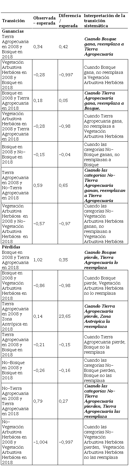 Respecto a las transiciones sistemáticas calculadas en términos de ganancias en el periodo 2008-2018, la primera sección de la Tabla 10 muestra que, cuando la categoría “Bosque” gana territorio, no reemplaza a “Vegetación Arbustiva y Herbácea”, sino a “Tierra Agropecuaria”, a un ritmo 0,42 % más rápido que si las zonas de “Bosque” hubiera experimentado una ganancia aleatoria.