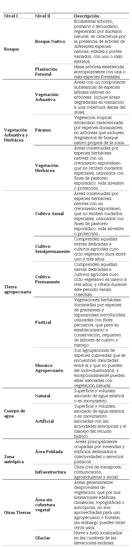 Las clases de cobertura y uso de la tierra que genera el MAATE, presentan dos niveles de leyenda (Ver Tabla 1), el primer nivel hace referencia a las 6 clases establecidas por el IPCC a nivel mundial; y el segundo nivel corresponde a las 16 subclases definidas en talleres realizados por entidades responsables de generar esta información: MAATE, Ministerio de Agricultura y Ganadería (MAG) y el Instituto Espacial Ecuatoriano (IEE) adscrito actualmente al Instituto Geográfico Militar (IGM) [26].