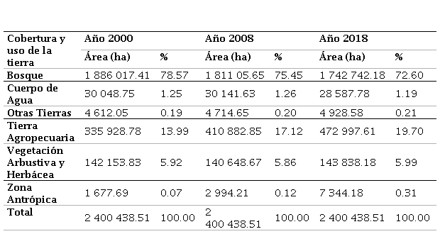 Al analizar los valores presentados, se aprecia que las categorías "Bosque", "Tierra Agropecuaria" y "Vegetación Arbustiva y Herbácea" son las de mayor extensión en la zona de estudio, cubriendo aproximadamente el 98% del territorio. En contraste, las categorías restantes, "Cuerpo de Agua", "Otras Tierras" y "Zona Antrópica", representan menos del 2%. Esta dinámica se mantiene de forma similar en las tres fechas de estudio 2000, 2008 y 2018.