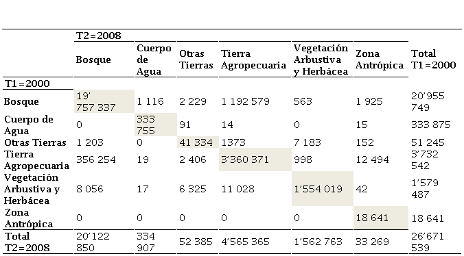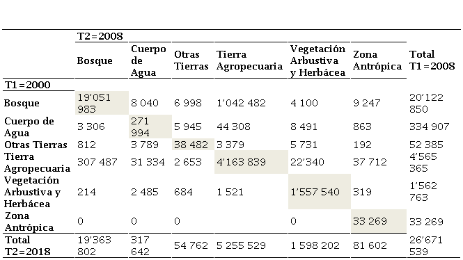 Previo a la identificación de transiciones sistemáticas, se construyó una matriz de transición con tasas brutas, en la que se sintetiza los cambios entre categorías de cobertura y uso de la tierra expresadas en número de celdas; cada celda (30x30m) a su vez equivale espacialmente a 0,09 ha. Estos cálculos se realizaron para cada periodo de interés evaluado (Tabla 4 y Tabla 5):