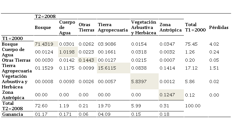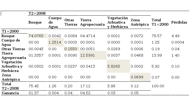 - Ganancias: indica el porcentaje de territorio que registra una ganancia bruta de la categoría j entre el tiempo 1 y 2. En la matriz de tabulación cruzada se representa: