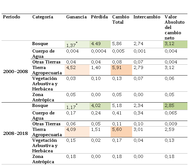 Por otra parte, las ganancias y pérdidas de las demás categorías: “Vegetación Arbustiva y Herbácea”, “Cuerpo de Agua”, “Otras Tierras” y “Zona Antrópica” (esta última con únicamente ganancias) registraron valores menores al 1 % del territorio provincial. Estos resultados sugieren un intercambio marcado entre las ganancias y pérdidas de las categorías “Bosque” y “Tierra Agropecuaria”.