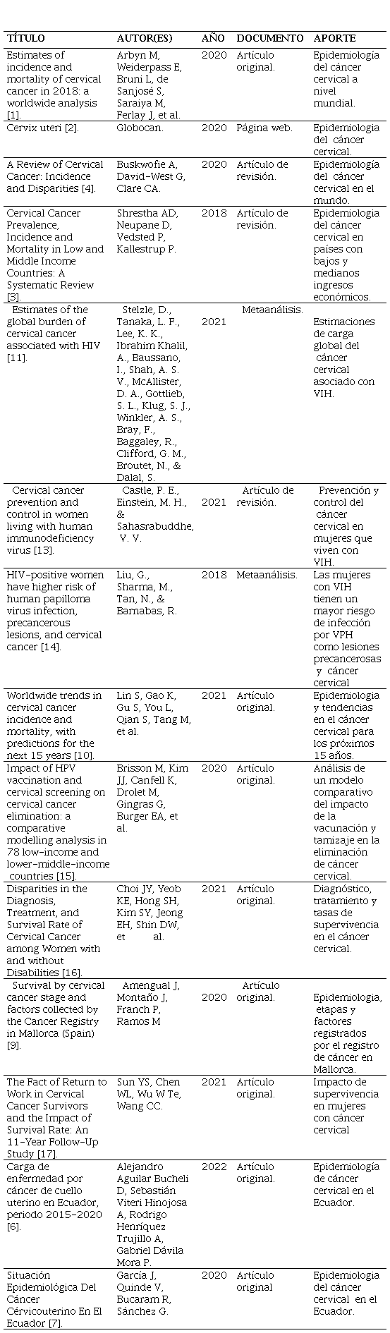 [6] A. Aguilar, D. Viteri, A. Henríquez y P. Dávila, Carga de enfermedad por cáncer de cuello uterino en Ecuador, periodo 2015-2020. Revista de Metro Ciencia, vol. 30, núm 2, pp. 10–17, 2022.