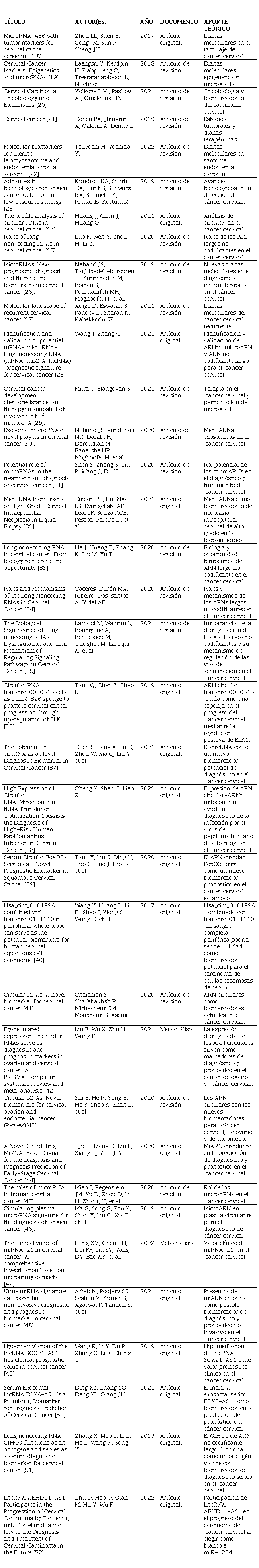 [59] M. Tornesello, R. Faraonio, L. Buonaguro, C. Annunziata, N. Starita y A. Cerasuolo, The Role of microRNAs, Long Non-coding RNAs, and Circular RNAs in Cervical Cancer. Revista de Frontiers in oncology, vol. 10, 2020.