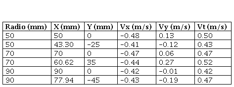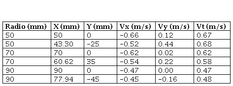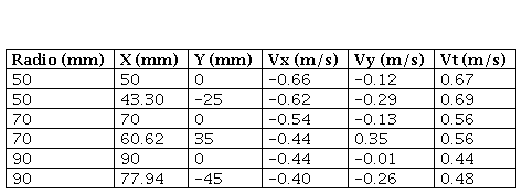 El componente óptico fue modificado para adaptarse al contenedor experimental. El robot fue programado para desplazarse siguiendo trayectorias circulares y realizar mediciones en radios de 50 mm, 70 mm y 90 mm, con 13 puntos por radio. Cada medición capturó los componentes de velocidad en los ejes X y Y, calculándose la velocidad tangencial mediante el teorema de Pitágoras.