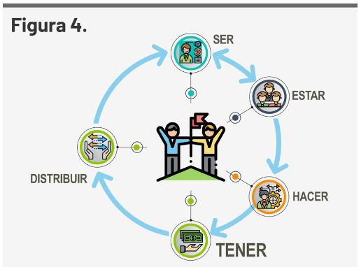 El análisis curricular y de implementación demostró que, en los semestres intermedios (del 4.º al 6.º), el estudiante pasa a una fase de creatividad e innovación vinculada a las diez conductas emprendedoras de McClelland previamente trabajadas en el contexto institucional. Esta fase se sustenta en el marco interno del círculo virtuoso del Ser, Estar, Hacer, Tener y Distribuir, enfatizando que el tener dinero se considera como un cuarto objetivo subordinado a dimensiones formativas previas.