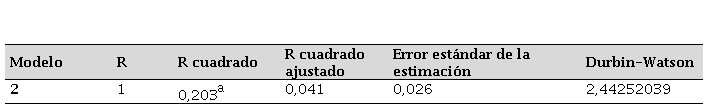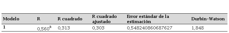 El coeficiente de correlación (R = 0,560) evidencia una relación moderada entre las variables independientes y la rentabilidad económica, mientras que el coeficiente de determinación (R² = 0,313) indica que el 31,3% de la variabilidad del ROA se explica por los componentes del capital intelectual. El estadístico Durbin-Watson (1,848) se encuentra dentro del rango aceptable, descartando autocorrelación significativa en los residuos. En conjunto, estos resultados demuestran que la eficiencia del capital estructural y del capital empleado tiene una incidencia directa sobre la rentabilidad económica del sector.