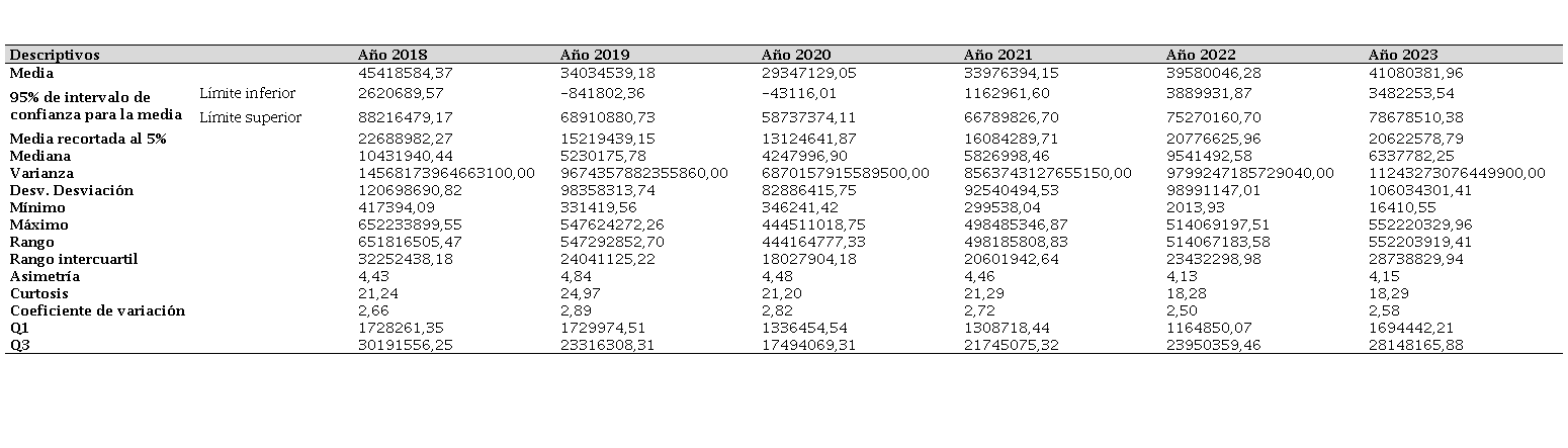 El análisis descriptivo del VAICTM muestra una amplia variabilidad entre años, con un comportamiento irregular que evidencia fluctuaciones en la eficiencia del capital intelectual. A pesar de que la media del indicador tiende a incrementarse en los últimos periodos, los valores de asimetría y curtosis indican la existencia de concentraciones marcadas en torno a empresas con niveles bajos de eficiencia, frente a un reducido grupo de organizaciones con rendimientos sobresalientes. El coeficiente de variación, superior a dos en la mayoría de los años, confirma la presencia de una alta dispersión dentro del sector.