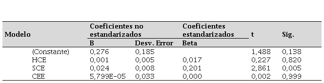 Finalmente, los resultados de las Tablas 5 y 6 confirman que el capital estructural y el capital empleado son los componentes más relevantes del capital intelectual en la determinación de la rentabilidad. El SCE presenta el coeficiente estandarizado más alto (β = 0,487) y el CEE también mantiene un efecto positivo (β = 0,279), ambos con niveles de significancia elevados (p < 0,001). Por su parte, el HCE no alcanza significancia estadística (p = 0,134), lo que indica una débil relación con los indicadores financieros. En consecuencia, los hallazgos sugieren que las empresas con estructuras organizacionales sólidas, sistemas eficientes y un uso racional del capital invertido son las que logran mayores niveles de rentabilidad, mientras que la falta de estrategias efectivas de gestión del talento limita el aprovechamiento del conocimiento como fuente de ventaja competitiva sostenible.