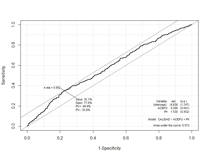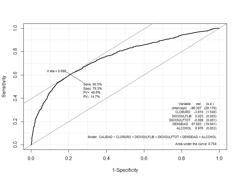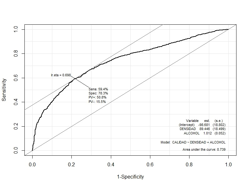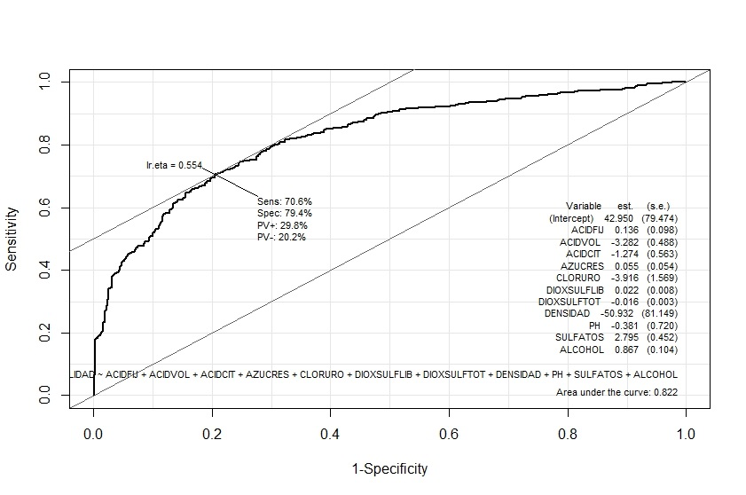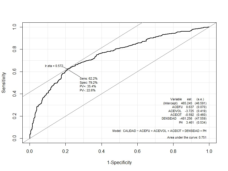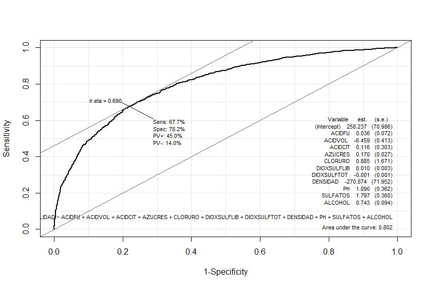 Los resultados que se obtuvieron indican que para el grupo #1, tanto para el vino tinto como para el vino blanco, los modelos tienen una buena capacidad discriminante, pues como se aprecia en las Figuras 1 y 2, los valores de AUC (Area Under the Curve) son mayores al 80%.