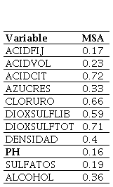 Se aplicó nuevamente el test y el valor de MSA general subió a 0.52, que ya sería un valor aceptable para poder continuar con el análisis, pero se recomienda también que los valores individuales de MSA sean de 0.5 o mayores. Para lograr esto se fueron eliminando las variables siguientes: alcohol, cloruro, dióxido de azufre total y dióxido de azufre libre, alcanzando el valor general de MSA de 0.68. Los valores individuales fueron todos mayores a 0.5 como se puede apreciar en la Tabla 5.