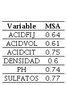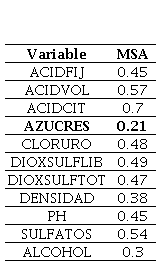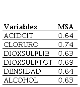 Se calculó el contraste de esfericidad de Bartlett para valorar la significación de la matriz de correlación, en este caso se puede desechar también la hipótesis de que es una matriz identidad pues el valor que se obtiene es prácticamente cero. Se calculó el MSA y se obtuvo un valor de 0.37 lo que indica que no se puede aplicar aún el análisis factorial por lo que se comenzó a eliminar variables una a una a partir de la de menor valor de MSA, esto puede apreciarse en la Tabla 8, el orden en que se eliminaron las variables fue: pH, sulfatos, acidez fija, acidez volátil y azúcar residual.