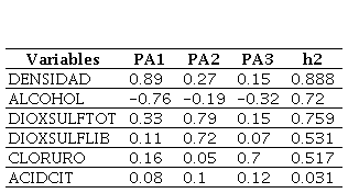 Al aplicar el análisis factorial para ambos conjuntos de datos iniciales se obtienen tres factores, en los cuales se agrupan cinco variables, las cuales fueron diferentes para los dos tipos de vinos. En ambos casos se eliminó una variable por tener un valor de comunalidad muy bajo.