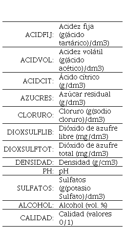 Los datos para ambos tipos de vinos fueron generados entre los años 2004 y 2009, son originarios de la región noroeste de Portugal [5] y tomados de la página de UCI Machine Learning Repository[1], los cuales se encuentran disponibles para que el público en general pueda hacer uso de ellos. Están divididos en datos de vino tinto y vino blanco en archivos independientes, en ambos casos tienen 11 variables físico-químicas y la variable de valoración del usuario (calidad), las cuales se pueden observar en la Tabla 1. La variable a pronosticar es CALIDAD, esta variable toma valores entre cero y diez dependiendo de la calificación que el cliente le asigna en función de sus gustos.