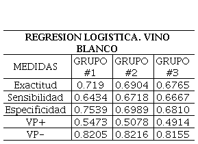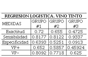 Las matrices de confusión que se obtienen cuando se aplica el método de regresión logística al conjunto de datos del vino tinto se puede apreciar en las Tablas 14, 15 y 16 respectivamente según al grupo que corresponde.