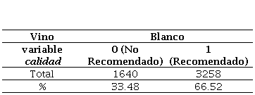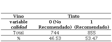 Los datos del vino blanco cuentan con 4898 registros y del vino tinto con 1599, se puede observar en las Tablas 2 y 3 cómo se distribuyen los valores cero y uno en la variable CALIDAD dependiendo del tipo de vino.