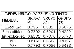 En las Tablas 30, 31 y 32 se muestran las matrices de confusión que resultaron de aplicar el modelo de redes neuronales para los tres conjuntos de variables. Se aprecia que el grupo #1 tiene mejores valores de predicción con respecto a las de los grupos #2 y #3. En las tres los resultados están lejos de la matriz de confusión óptima para el vino tinto mostrada en la Tabla 12, aunque se puede apreciar que los resultados del grupo #1 son los mejores que se han obtenido si lo comparamos con los modelos vistos anteriormente.