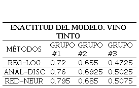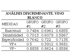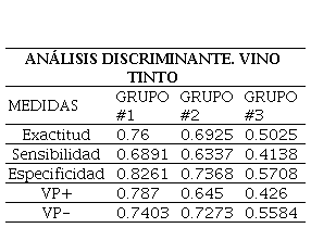 En la Tabla 25 se muestran los resultados del análisis discriminante para los datos del vino tinto. Si se comparan con los del modelo de regresión logística se aprecia que la exactitud para cada grupo aumenta en casi un 4%, esto es importante resaltarlo porque es un indicador de que con el método de análisis discriminante la predicción aumenta.