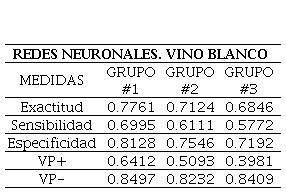 En las Tablas 35, 36 y 37 se muestran las matrices de confusión al emplear las redes neuronales en los tres conjuntos de datos del vino blanco. Los resultados indican que la matriz del grupo #1 es la que más se acerca a la matriz de confusión óptima del vino blanco que se puede apreciar en la Tabla 13.