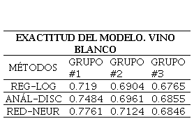 En las Tablas 26, 27 y 28 se observan los resultados de la matriz de confusión para los tres grupos del vino blanco. Se aprecian diferencias en las predicciones, sobre todo en los resultados del grupo #3.
