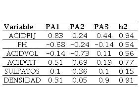 En este caso se puede observar que la variable sulfatos (SULFATOS) no tiene una carga factorial grande y su comunalidad es muy baja lo que indica que puede eliminarse del estudio. El análisis factorial nos indica que las variables acidez fija (ACIDFIJ) y el pH (PH) pertenecen al factor uno, las variables acidez volátil (ACIDVOL) y el ácido cítrico (ACIDCIT) pertenecen al dos y finalmente la variable densidad (DENSIDAD) al tres. Para este resultado se obtuvo una varianza acumulada del 64%. Luego de aplicar este método solo quedaron cinco variables; estas fueron las que se emplearon para realizar el pronóstico de la preferencia del vino tinto, de un total inicial de 11.