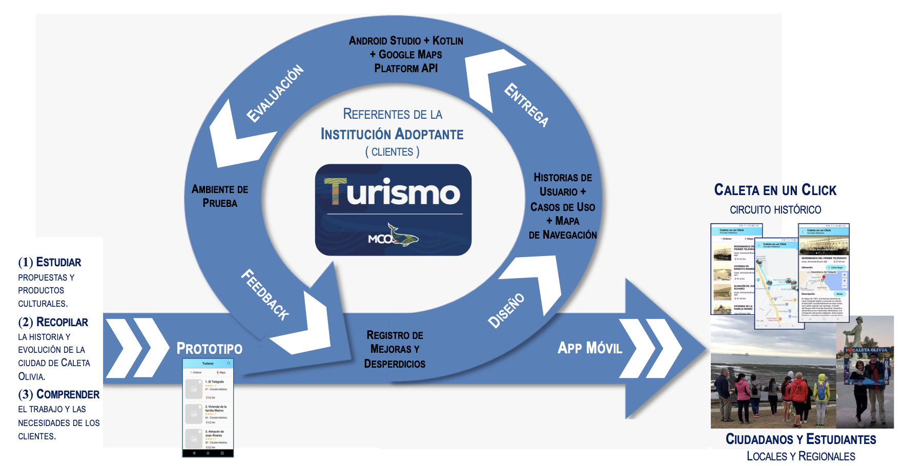 Por otra parte, al considerar el estudio de Urvina et al. [5] en la Sección 2.2, se identifican aspectos coincidentes y relevantes al momento de gestar un proyecto de desarrollo de un producto digital, para regiones menos pobladas con predominio de la naturaleza. La Patagonia Argentina, como una región extensa, aún muy agreste y alejada de las grandes urbes, presenta algunos desafíos de los cuales la ciudad de Caleta Olivia no está exenta. La necesidad de fortalecimiento de procesos de digitalización, de promoción del destino y de mejora de la infraestructura de conectividad de red son, entre otros, algunos ejemplos de estos desafíos. Por lo tanto, en el proceso de desarrollo de la App para un destino emergente como la ciudad de Caleta Olivia, se han reunido y considerado todos estos desafíos para ser tratados y discutidos con la Institución Adoptante (clientes). En tal sentido, ya se han definido algunas acciones conjuntas a los efectos de mitigar los aspectos vinculados el bajo porcentaje en el uso de las Apps de turismo, que subraya el trabajo de Urvina et al.[5]. Específicamente, algunas de estas acciones que ya se han concretado son: (i) entrevistas en radios locales [https://www.facebook.com/watch/live/?ref=watch_permalink&v=1973936793044958], (ii) impresión y distribución en sitios de la ciudad del código QR de la App, (iii) artículos y entrevistas publicados en redes sociales y diarios locales y regionales [https://www.facebook.com/share/v/BmWHdbJ6WGbzKkSn/?mibextid=qi2Omg , https://vocesyapuntes.com/se-presento-la-app-caleta-en-un-click-modulo-circuito-historico/] y, (iii) evento para el lanzamiento formal de la App en el auditorio del cine del Centro Cultural de la ciudad [https://www.facebook.com/watch/live/?ref=watch_permalink&v=3839742179685613], con la presencia de funcionarios del Municipio de Caleta Olivia y otros de la región; miembros de la Cámara de Comercio, fuerzas de la Prefectura Naval Argentina, ciudadanía en general y alumnos de establecimientos educativos, en particular de la Escuela Primaria N°14, escuela centeneria de la ciudad que forma parte del circuito histórico que propone la App.