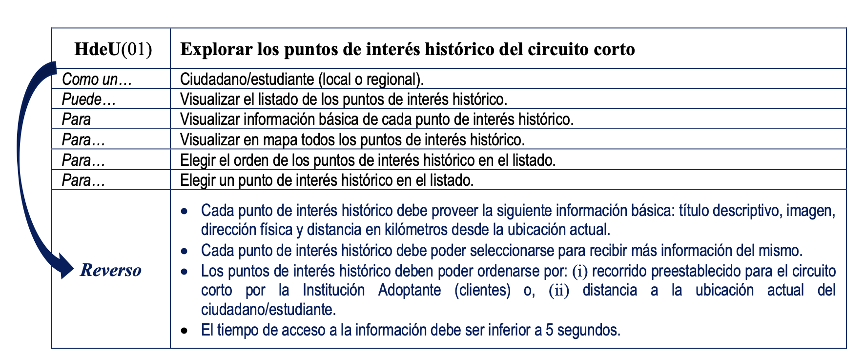 En primera instancia, y como ejemplo de cómo se aplica la técnica historias de usuario, la Figura 7, presenta la HdeU(01), correspondiente a “Explorar puntos de interés histórico del circuito corto”. En el frente de la tarjeta se especifica: (i) Como un…, quien es el usuario (ciudadano o estudiante local o regional) para el cual se cubre una necesidad; (ii) Puede…, que es lo que se quiere que ocurra, ya sea, una característica o una funcionalidad; (iii) Para…, que es el valor que se quiere que obtenga el usuario con la implementación de la característica o funcionalidad. Mientras que, en el reverso de la tarjeta, se especifican un conjunto de requerimientos que debe cumplir la característica o funcionalidad, los cuales sirven para detallar la historia de usuario y definir un patrón de valor a alcanzar con la ejecución de la misma.