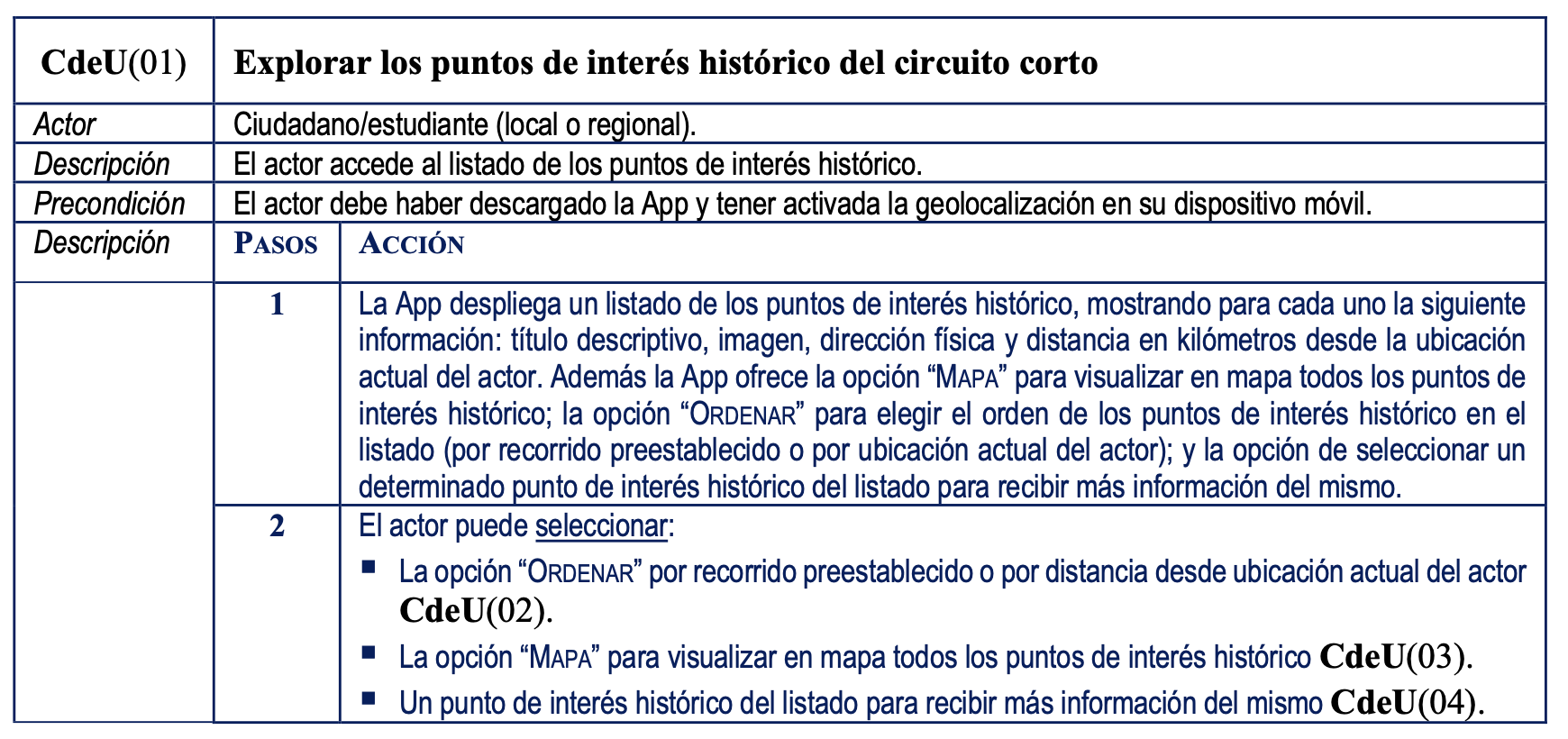 En segunda instancia, y como ejemplo de cómo se aplica la técnica de casos de uso, la Figura 8, presenta el CdeU(01), correspondiente a “Explorar los puntos de interés histórico del circuito corto”. Este caso de uso especifica la funcionalidad ofrecida por la App en su primera interfaz, estableciendo la información inicial que se debe suministrar y las opciones de selección que se deben ofrecer para que el usuario continue con la interacción. Tal como prescribe esta técnica de modelado, el CdeU(01) también especifica su vinculación con otros casos de uso: CdeU(02) “Ordenar los puntos de interés histórico”, CdeU(03) “Visualizar en mapa los puntos de interés histórico” y CdeU(04) “Explorar un punto de interés histórico; los cuales le permiten al usuario establecer vínculos de navegación para acceder a otras funcionalidades provistas por la App. De esta manera, se definen los casos de uso para cada una de las funcionalidades, que ha establecido la Institución Adoptante (clientes) para la ejecución del recorrido del circuito histórico corto de la ciudad de Caleta Olivia.