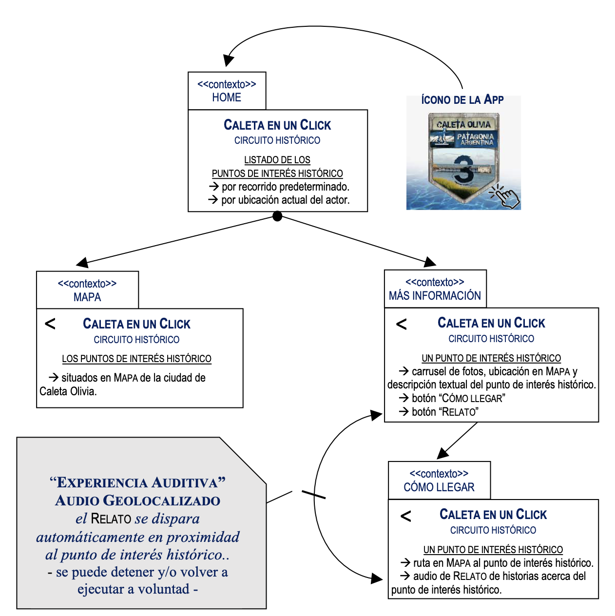 Diseño: durante el ciclo ágil y teniendo en mente el circuito histórico corto establecido e implementado en la ciudad por la Subsecretaria de Turismo de Caleta Olivia (ver Sección 3.1), se registran las decisiones de diseño utilizando herramientas conceptuales, tales como: (i) Historias de Usuario para mantener el enfoque en el objetivo y prioridades del proyecto; y (ii) Mapa de Navegación, para mantener una representación visual de las interfaces que conforman la App y definir una jerarquía de vinculación entre ellas, que permita acceder a cada contenido de manera intuitiva y ordenada.