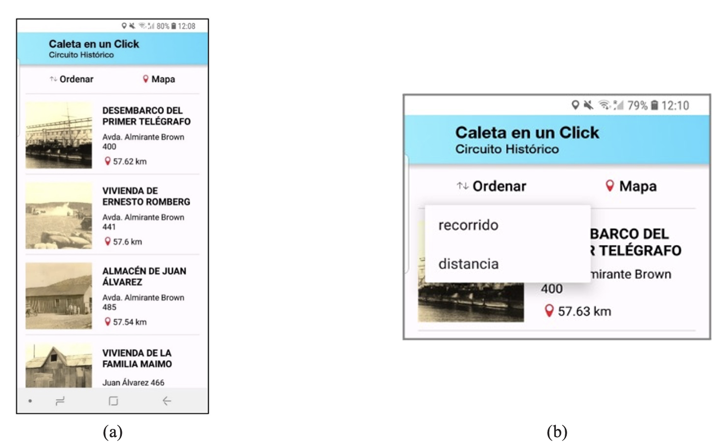 Tal como prescriben la HdeU(01) en la Figura 7 y el CdeU(01) en la Figura 8, por cada punto de interés histórico la App ofrece la siguiente información: título descriptivo, imagen, dirección física y distancia en kilómetros desde la ubicación actual del usuario ciudadano/estudiante (local o regional). Además, la Figura 11(b), muestra en la parte superior 2 opciones seleccionables “Ordenar” y “Mapa”. La opción “Ordenar” permite cambiar el orden de los puntos de interés histórico en el listado, entre: (i) ordenar por recorrido preestablecido y, (ii) ordenar por distancia desde la ubicación actual del usuario.