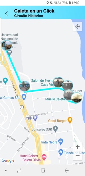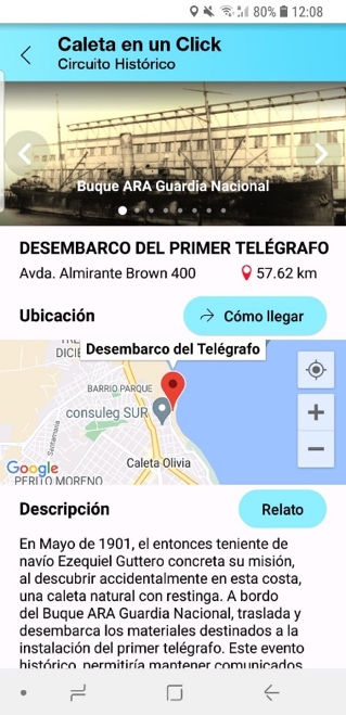 Tal como ya se ha señalado, el proyecto PDTS se enmarca en los lineamientos de promoción del turismo del Municipio de Caleta Olivia. Los circuitos turísticos son parte importante de las propuestas y consisten en caminatas guiadas por personal de la Subsecretaría de Turismo. En particular, el “Circuito Histórico Corto” ofrece a residentes locales, regionales y alumnos una propuesta para conocer un poco más sobre el lugar en el que viven. Este circuito está compuesto por los siguientes 6 (seis) puntos de interés histórico: (1) origen de la ciudad con la llegada del telégrafo; (2) vivienda de Ernesto Romberg; (3) almacén de Juan Álvarez; (4) vivienda de la familia Maimo; (5) escuela n°14 “20 de noviembre” y; (6) surtidor de combustible de Máximo Berezowsky. Así, el propósito del PDTS es desarrollar una aplicación móvil con funcionalidad similar a la de una Guía Turística, que invite a recorrer estos lugares y fomente la sensibilidad turística ciudadana, al consolidar el sentido de identidad y pertenencia y reforzar los lazos del arraigo.