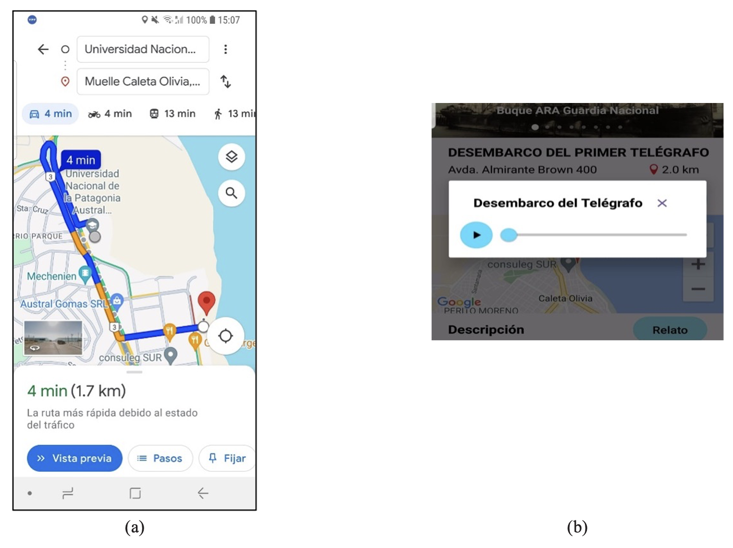 La Figura 14(a), presenta la interfaz que se corresponde con el contexto Cómo llegar en el mapa de navegación (ver Figura 9). Esta interfaz se despliega cuando se selecciona el botón “Cómo llegar” en la interfaz de la Figura 13, para recibir la ruta y las indicaciones (de acuerdo con cómo se desplaza el usuario: si caminado o en algún tipo de transporte), al punto de interés histórico en el mapa de la ciudad y desde la ubicación actual del usuario. La Figura 14(b), muestra la ejecución del Relato, el cual se dispara automáticamente cuando la App usando la capacidad de geolocalización, detecta que el usuario se encuentra en proximidad al punto de interés histórico (audio geolocalizado). Este Relato tiene como objetivo proporcionar una experiencia auditiva, para contribuir a la inmersión del usuario en la relevancia histórica del punto de interés al que está arribando; el audio Relato se puede detener y/o volver a ejecutar a voluntad del usuario.