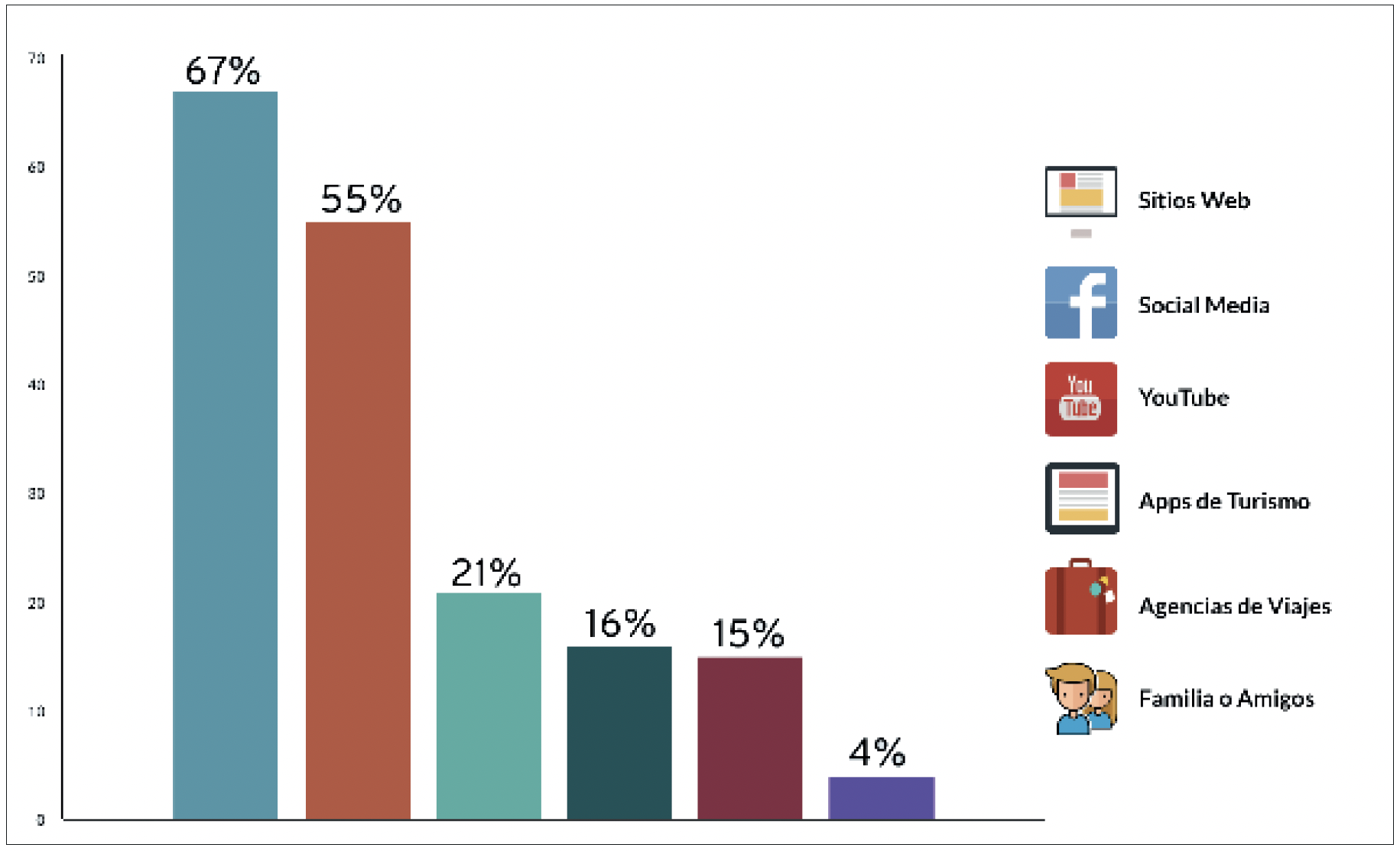 Dentro de este marco de investigación, se realiza una encuesta a 382 turistas nacionales e internacionales. A partir de esta encuesta, los autores analizan los resultados desde diferentes perspectivas, presentan las conclusiones alcanzadas e ilustran los hallazgos, mostrando porcentajes con representaciones gráficas. La Figura 2, muestra las preferencias de los turistas que arriban a la región, donde, por ejemplo, se visualiza que sólo el 16% recurre al uso de Apps de turismo. Respecto a los motivos del bajo porcentaje de uso de Apps de turismo, los autores concluyen lo siguiente: (i) poca cultura digital por parte de los prestadores de servicios y autoridades; (ii) baja adopción de nuevas tecnologías para el sector turístico; (iii) falta de promoción de los escasos productos turísticos digitalizados existentes; (iv) carencia de un sector turístico privado que invierta en digitalizar la oferta, para que las empresas turísticas locales puedan beneficiarse; y (v) respaldo del sector público (gobiernos municipal y provincial), como poseedor de las competencias en materia de turismo en el territorio. El análisis llevado a cabo por los autores en una región Latinoamericana donde aún predominan los destinos más naturales y agrestes, aporta al desarrollo de productos turísticos concebidos para destinos emergentes con estas características.