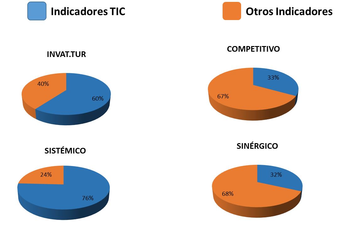 En Herrera-Prado et al.[10], se desarrolla una investigación para determinar la participación de las TIC, en los ejes estratégicos que componen los modelos conceptuales para Destinos Turísticos Inteligentes (DTI). En primera instancia, se realiza un estudio metodológico cualitativo con una revisión exhaustiva de la literatura sobre los modelos DTI. Luego, se realiza un análisis cuantitativo de los modelos seleccionados, considerando como categorías de análisis los ejes estratégicos y los indicadores de esos modelos, que estuvieran relacionados con las TIC. De la revisión de la literatura, se seleccionan 4 modelos DTI y se analiza la estructura de cada uno para conocer los ejes estratégicos que la conforman, como así también, los indicadores que utilizan TIC para evaluar un destino turístico. El trabajo ofrece una breve descripción de los 4 modelos conceptuales seleccionados, los cuales reflejan estructuras diversas: (M1) DTI Invat.tur [11]; (M2) DTI Competitivo [12]; (M3) DTI Sistémico [13]; y (M4) DTI Sinérgico [14]. Finalmente, los autores aplican un conjunto de ecuaciones para realizar un análisis cuantitativo, que toma en cuenta los ejes estratégicos y los indicadores relacionados con las TIC. Este análisis cuantitativo, les permite calcular el porcentaje de indicadores TIC que tiene cada modelo, como así también, el cálculo del grado de participación de indicadores TIC por eje estratégico. La Figura 3, ilustra los resultados alcanzados, al comparar porcentualmente los indicadores TIC por sobre los otros indicadores para cada uno de los 4 modelos conceptuales DTI.