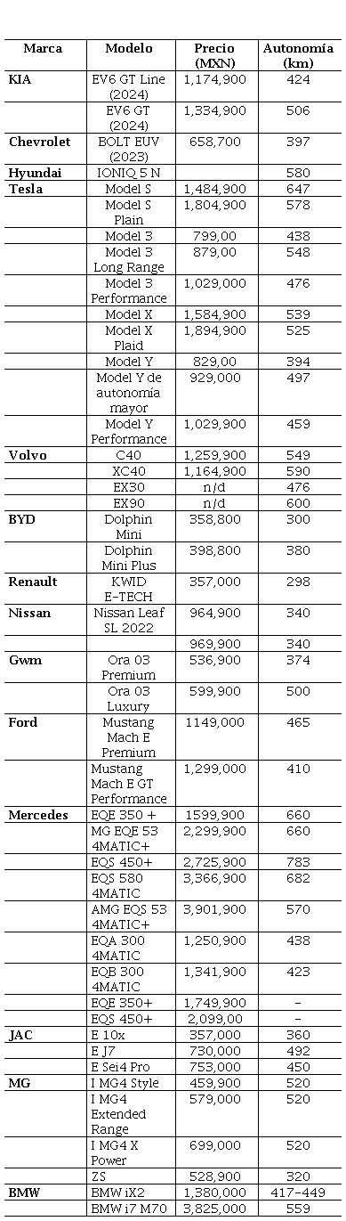 Para llevar a cabo este análisis, se optó por realizar un estudio exploratorio de carácter cuantitativo con un enfoque descriptivo. Se emplearon técnicas de recolección de datos, con el fin de obtener información detallada sobre las perspectivas de los conductores de Sinaloa en relación con los VEs; en lo que respecta a la selección de participantes, se tomó una muestra representativa de conductores del estado. Se diseñó un cuestionario que abordó temáticas relacionadas con el conocimiento de los VEs, las ventajas y desventajas percibidas, las barreras para su adopción y las expectativas sobre su futuro. Asimismo, se recopilaron datos e información de las páginas oficiales de las marcas de automóviles, considerando aquellos totalmente eléctricos disponibles en el mercado actual, destacando precio de venta y autonomía, como se puede observar en la Tabla 1. Algunas marcas con presencia en el estado de Sinaloa pero que solo ofrecen opciones hibridas se encuentra Chirey, Honda, Toyota y Mitsubishi; y las que aún no ofrecen ninguna opción están Volkswagen, Acura, Dodge, Mazda, Cupra, Omoda, Fiat y Jeep