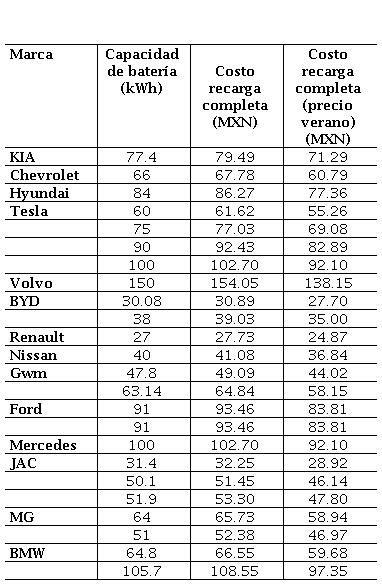 Así mismo, en la Tabla 2 se resume el gasto energético total de la carga, para ello se consideró la capacidad de las baterías (kW/h) por el precio del kilovatio por hora de referencia (según la Comisión Federal de Electricidad - CFE). Los costos manejados por la CFE para Sinaloa son de $1.027 (MXN) los primero 175 kW/h y $1.251 para cada uno de los siguientes 225 kW/h. En el caso de la tarifa de verano los valores cambian a $0.921 y $1.067 respectivamente. La Tabla 2 resume las capacidades de las baterías de diversos vehículos eléctricos disponibles en el mercado y el costo de la recarga completa, considerando los precios de la CFE en el Estado de Sinaloa, mencionados anteriormente. Para fines comparativos, si se consideran en los vehículos de gasolina tanques de 40 a 60 litros, el costo de llenarlo actualmente es de $22.17 y $23.98 de gasolina magna y premium respectivamente; por lo tanto, una carga completa de gasolina magna correspondería a un gasto de entre $886 a $1330.20 y de premium entre $959.20 y $1438.80 para alcanzar las autonomías correspondientes a la Tabla 1.