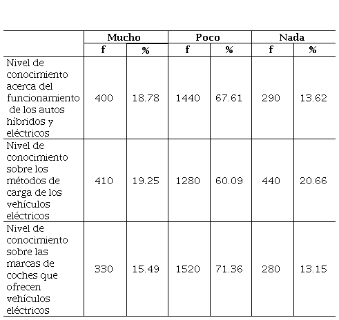 Una vez recopilados y examinados los datos demográficos de los encuestados, se procedió a analizar el siguiente bloque del cuestionario, el cual proporcionó información relevante. En esta segunda sección se evaluó el nivel de conocimiento respecto a los vehículos eléctricos. Para ello, se utilizó una escala de Likert de tres niveles, definida como: mucho, poco y nada. Todas las afirmaciones y resultados se presentan detalladamente en la Tabla 4.