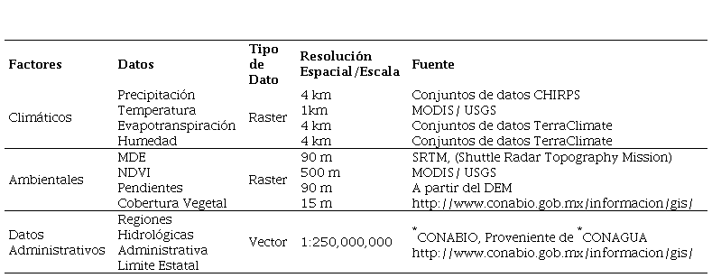 Para realizar el modelado de factores ambientales y climáticos mediante un enfoque Multicriterio y así identificar zonas áridas en la región Noroeste de México, se seleccionaron algunos factores identificados previamente con base al estudio generado en [22], a una revisión de la literatura y consulta a expertos (Tabla 1) y se seleccionó como periodo de evaluación el año 2023.