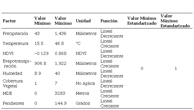 En esta investigación se utilizó el método de lógica difusa [39] para obtener una homogenización entre las diferentes unidades de medida de los factores, y el rango de escala 0 - 1 bits, donde valores cercanos a 0 representan regiones vulnerables a aridez y valores cercaos a 1 representa zonas menos aptas a presentar aridez. De este modo, se obtuvieron 7 factores normalizados (Tabla 3).