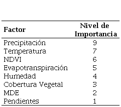 Para evaluar el proceso de toma de decisiones y determinar las prioridades de cada factor, se estableció el nivel de importancia para cada uno asignándoles un valor (Tabla 4), esto se llevó a cabo con base al estudio realizado en [22], una revisión de la literatura y consulta a expertos. Se tomaron en cuenta la opinión de 17 de expertos: 8 de la Facultad de Ciencias de la Tierra y del Espacio de la Universidad Autónoma de Sinaloa (UAS), 4 de la Comisión Nacional Forestal (CONAFOR) y 5 de la Secretaría de Medio Ambiente y Recursos Naturales (SEMARNAT). Estos dictámenes se utilizaron para establecer la relevancia y los pesos asignados a los factores en la evaluación de la idoneidad para la aridez.