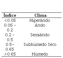 Para obtener el mapa de zonas áridas, se utilizó la clasificación propuesta por la UNEP (United Nations Environment Program) mostrada en la Tabla 5, la cual determina el tipo de clima en 5 categorías [32]. [45].