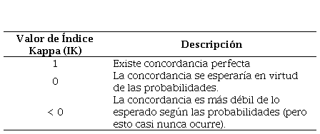 (2)Donde IK es el índice Kappa, Pr(a) es el acuerdo observado y Pr(e) es la probabilidad hipotética. Los posibles valores del IK se muestran en la Tabla 6.