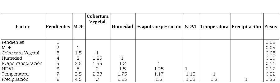 Como resultado de la ponderación de los factores mediante la aplicación de AHP y considerando el nivel de importancia de cada uno de ellos en relación con los demás, se generó una matriz de factores ponderados y pesos definitivas la cual se muestra en la Tabla 7.