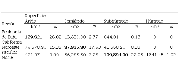 Mientras que el 30.48% representan zonas semiáridas, ya que estas se ubican mayormente en la región de Sonora y al oeste de Sinaloa en las cuales predominan los climas de tipo seco y semiseco. Por su parte, las regiones subhúmedas abarcan el 27.67%, localizadas en su mayoría en la Cuenca Pacifico Norte, debido a que en esta zona se encuentra la Sierra Madre Occidental la cual es considerada como una región altamente diversa tanto en vegetación, temperatura y precipitación. Finalmente, las regiones húmedas fueron representadas en menor con menos del 1% del área de estudio localizadas en la parte este, donde se ubica la Sierra Madre Occidental.