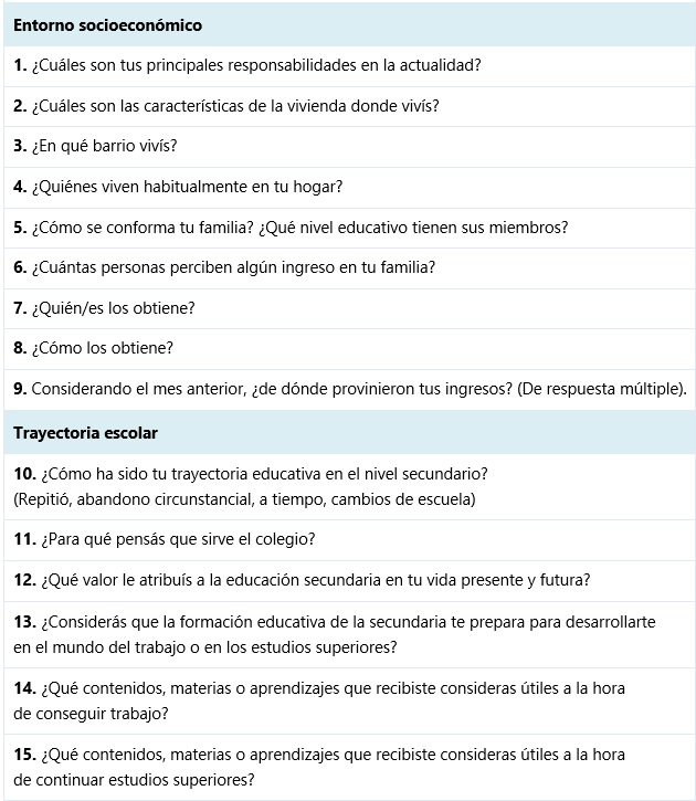 Los/as entrevistados/as fueron previamente informados sobre la convocatoria y participaron por voluntad propia.4 Como fuente primaria de recolección de datos se empleó la entrevista en profundidad de tipo semiestructurada,5 con el objeto dar respuesta a las principales áreas de análisis de la investigación: las trayectorias escolares; las representaciones sobre el mercado laboral y los estudios superiores; el papel del entorno sociofamiliar; y las proyecciones personales de futuro [Ver Apéndice B del Apartado metodológico].
